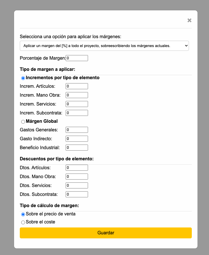 Supongamos que tienes un proyecto de construcción con diversas partidas de artículos, mano de obra, servicios y subcontratas. Al utilizar este modal, podrías: